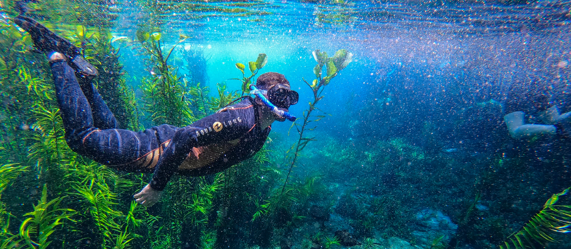 Flutuação de 840m em águas transparentes, com luz solar penetrante e plantas subaquáticas